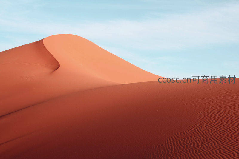 在纯净蓝天的映衬下,赤红色的沙丘如凝固的波浪般延展,其流畅的曲线与鲜明的色彩构成一幅视觉盛宴。