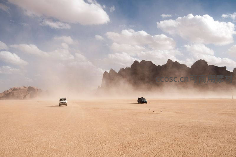 两辆越野车在广袤沙地上疾驰,扬起滚滚尘烟,远处岩石山峦与蓝天白云构成一幅充满动感的冒险图景。