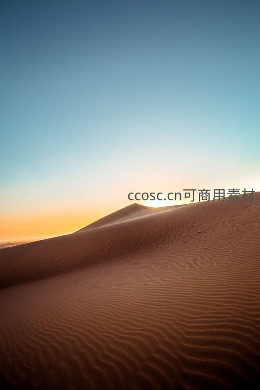 夕阳西下,柔和的光线勾勒出沙丘起伏的优美曲线,天空由蓝渐变为暖橙,营造出一片宁静祥和的氛围。