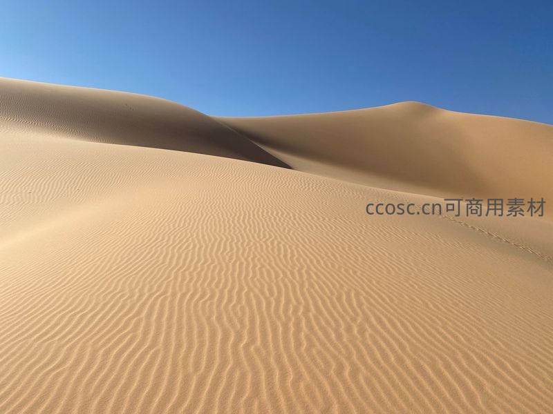 在无垠的蓝色天空下,金色的沙丘连绵不绝,细腻的沙纹在阳光下熠熠生辉,展现出大自然鬼斧神工的壮丽景象。