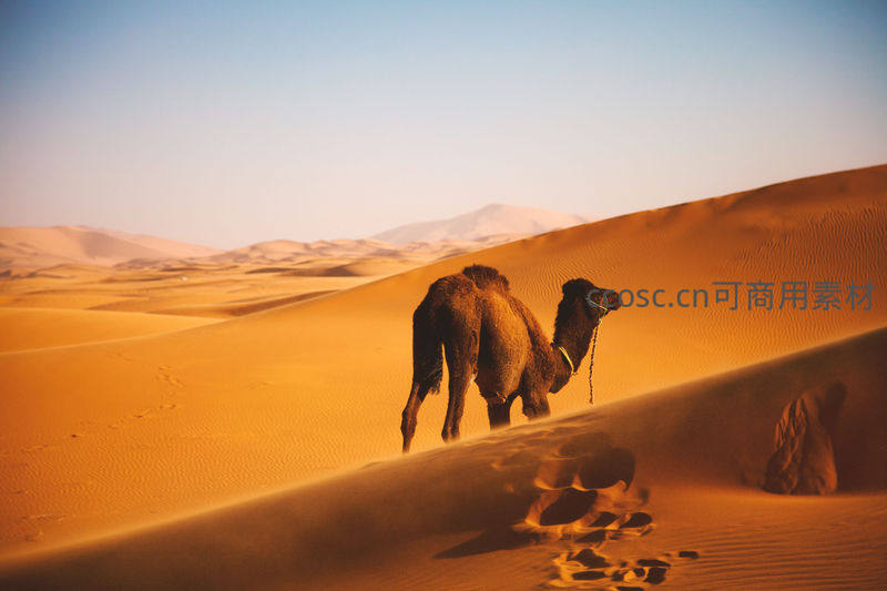 一只健硕的单峰驼背对镜头,缓步于被夕阳染成金黄的沙丘之巅,身后是连绵起伏的沙浪,尽显沙漠腹地的辽阔与苍凉。