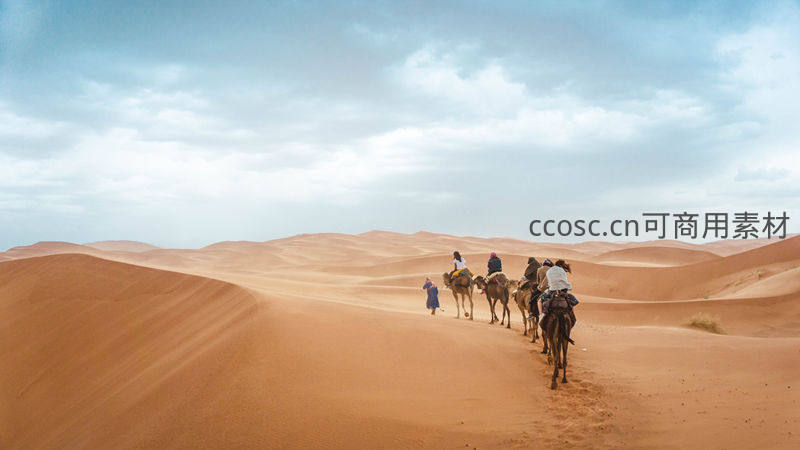 一队骆驼载着旅人缓缓行进在无垠沙丘之上,身后留下蜿蜒足迹,头顶是变幻的云彩,仿佛重走古老的丝绸之路。