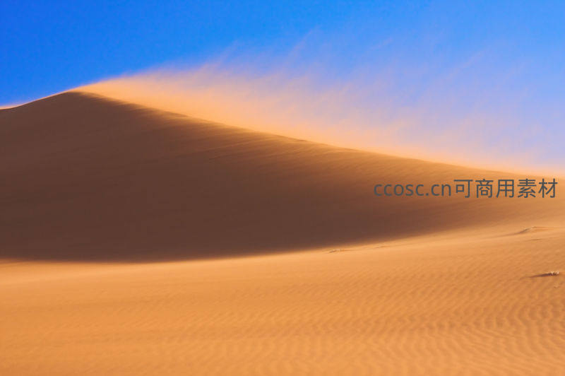 强劲的风在沙丘顶部卷起细沙,形成飘渺的沙雾,金黄色的沙粒在蓝天映衬下流动不息,展现自然力量的动态之美。