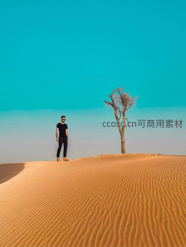 一位身着黑衣的男子站在金色沙丘之巅,身旁是一棵光秃的枯树,头顶是纯净如洗的碧蓝色天空,构成一幅充满艺术感的对比画面。