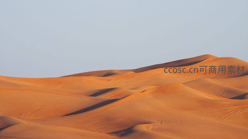 在清澈的淡蓝色天空下,一片片橙红色的沙丘如凝固的波浪般延展,其流畅的线条和细腻的光影变化展现了大自然鬼斧神工的雕塑之美。