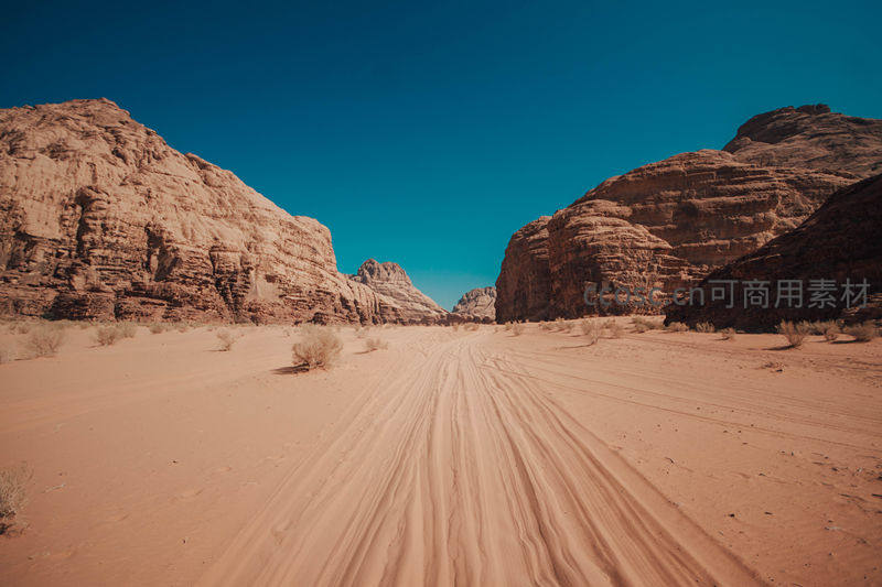 车辙印记延伸向峡谷深处的荒漠之路