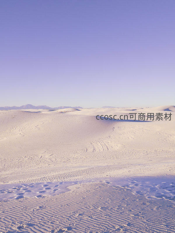 无垠的白色沙丘沐浴在柔和的晨光中,细腻的沙纹与远方山脉构成一幅纯净、宁静的大地画卷。