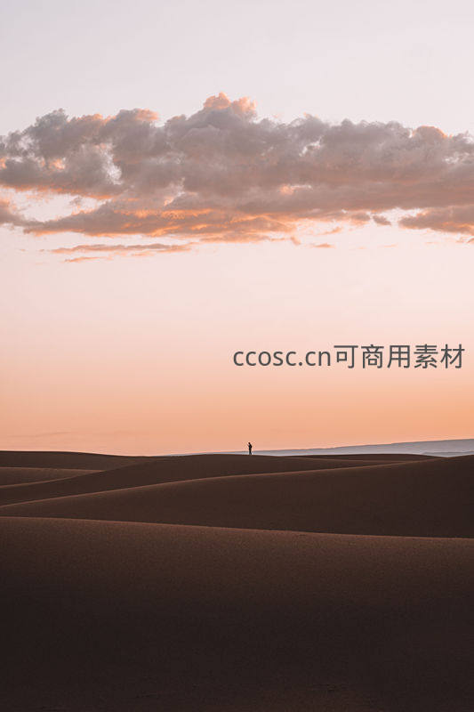 一人孤独的身影伫立在沙丘顶端,背对镜头凝望被晚霞染成粉橙色的天空,营造出深邃而宁静的意境。