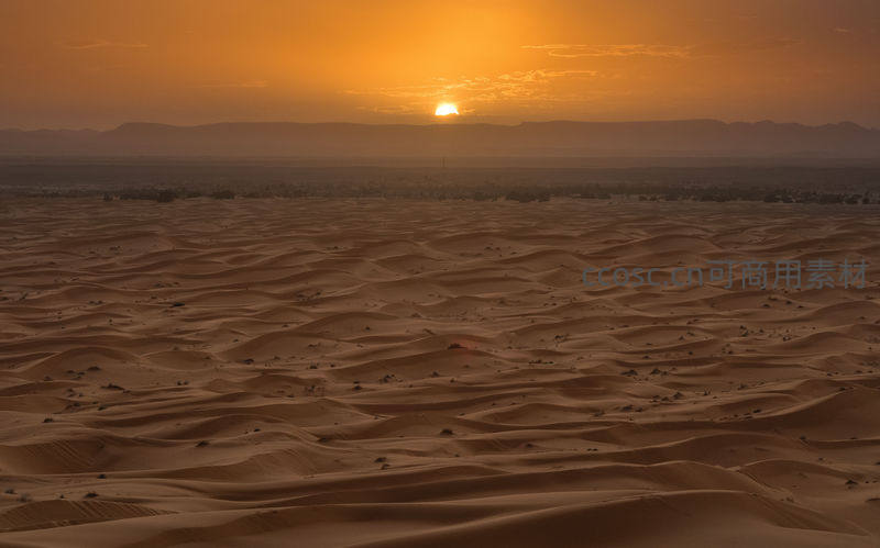 夕阳沉入远山,将整个沙漠染成一片辉煌的金色,沙丘的轮廓在余晖中显得格外柔和而壮丽。