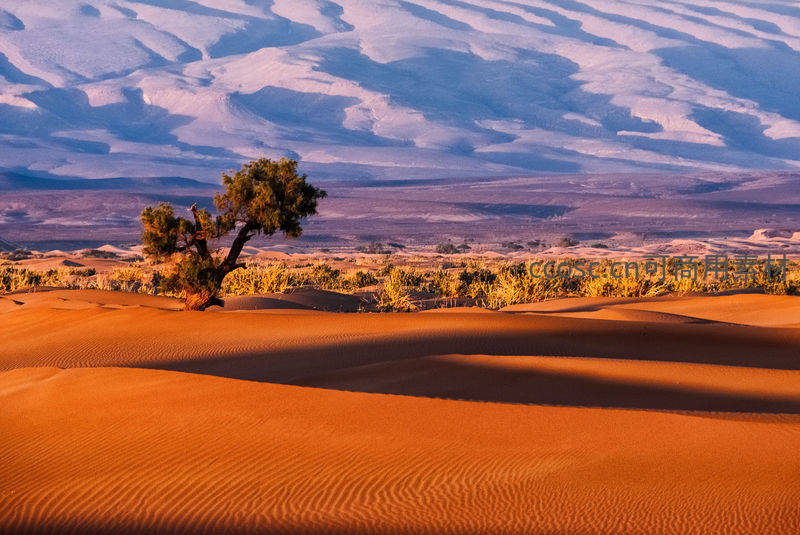 孤树傲立沙海映霞光万丈