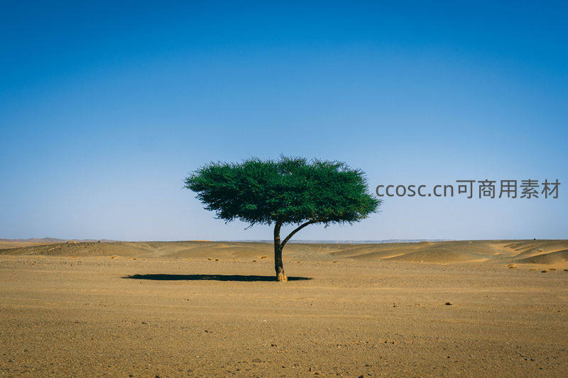 在无垠的沙海中央,一棵绿树独自伫立,浓密的树冠在湛蓝天空下投下阴影,成为荒芜中的生命象征。