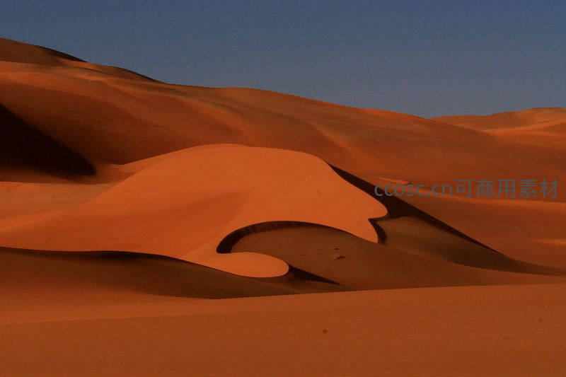 夕阳西下,橙红色的沙丘被柔和的光线勾勒出优美的曲线,营造出一种温暖而静谧的氛围。