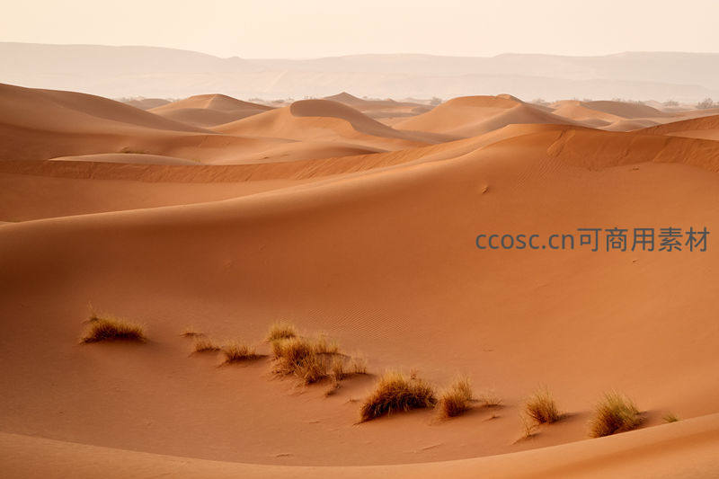 在无垠的沙海中,几簇顽强的草丛点缀其间,展现了生命在严酷环境中不屈不挠的生存力量。