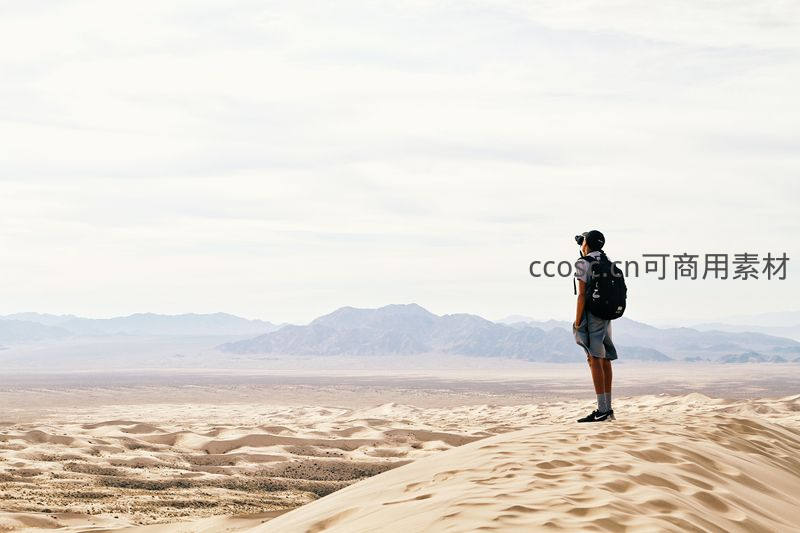 一位背着行囊的旅人静立于沙丘之巅,凝望远方连绵的山脉,在广袤天地间感受内心的宁静与探索的渴望。