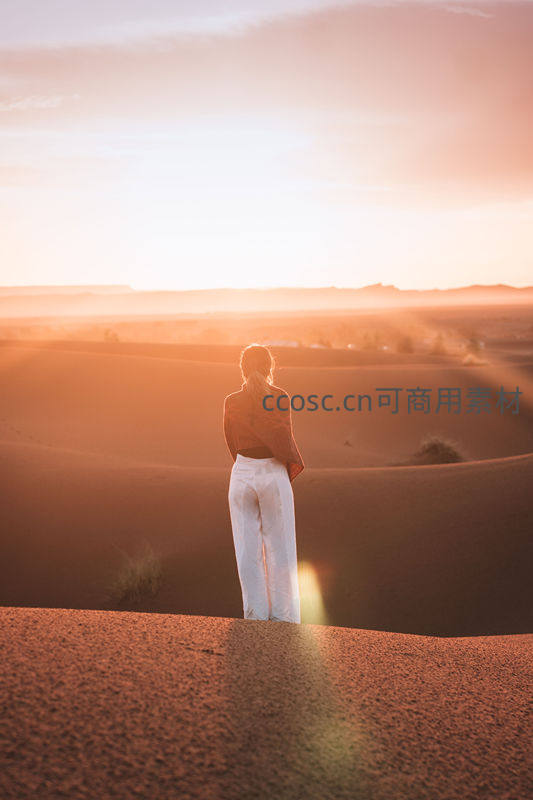 一位女子背对镜头,伫立在沙丘之上,沐浴在金色的夕阳余晖中,静静凝望着无垠的沙海,充满诗意与遐想。