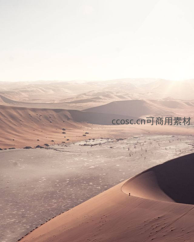 从高处俯视广袤的沙丘与干涸盐湖,远处地平线模糊,一人独行于沙脊之上,营造出苍凉而震撼的视觉冲击力。