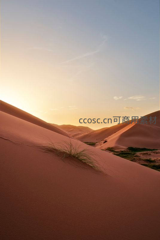 夕阳余晖洒满沙丘,一株顽强的草在风中摇曳,暖色调铺满画面,营造出温柔、宁静且充满诗意的黄昏氛围。