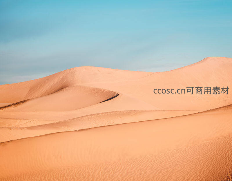 连绵的沙丘呈现出流畅柔和的曲线,与淡蓝色的天空无缝衔接,营造出一种宁静、开阔且富有韵律感的自然美学意境。