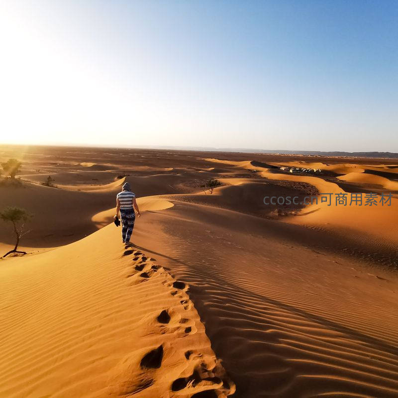 一人独行于金色沙丘之上,身后留下一串清晰足迹,夕阳余晖洒满无垠荒漠,尽显壮阔与孤寂之美。