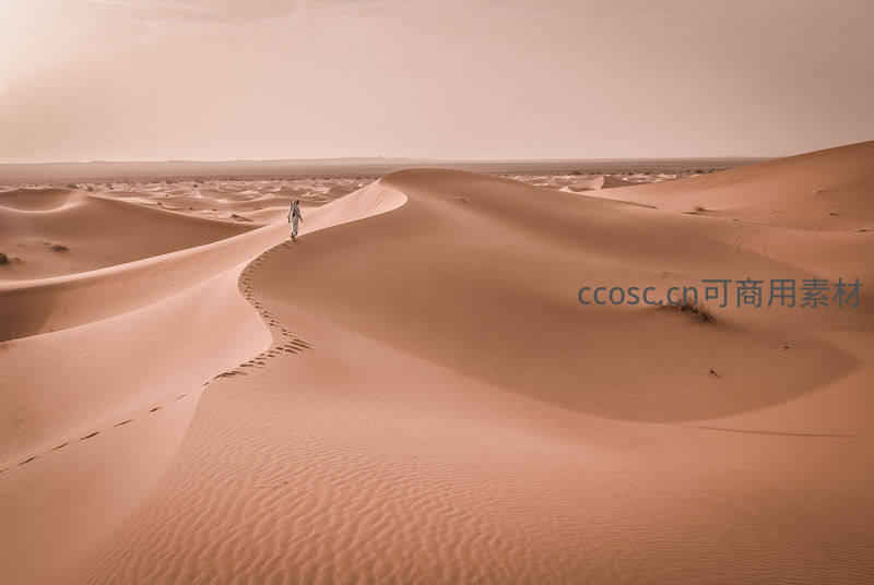 一人沿着蜿蜒沙脊前行,身后足迹渐行渐远,暖色调笼罩下的沙漠空旷而静谧,充满探索与内省的气息。