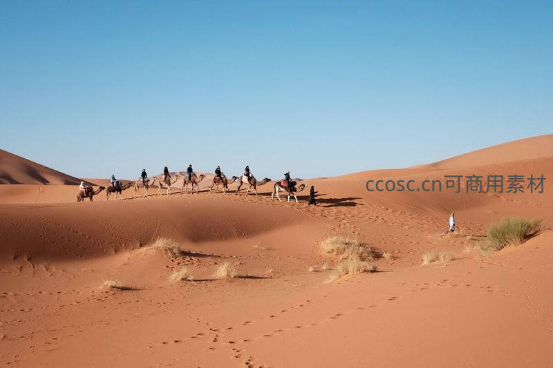 一行骆驼在湛蓝天空下穿越赤红沙丘,驼铃轻响,足迹延伸远方,再现了沙漠之旅的经典画面与悠远意境。