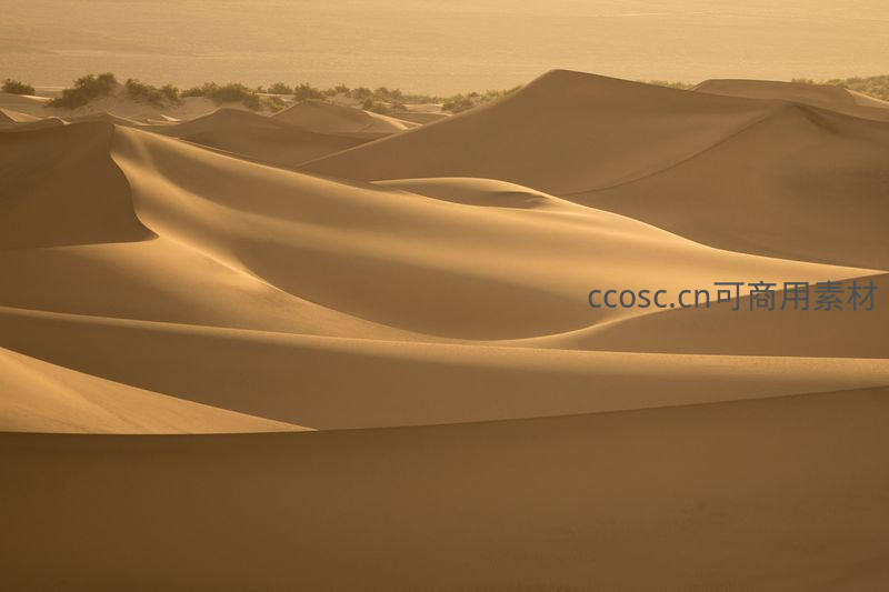 清晨的阳光温柔地洒在广袤的沙丘上,形成一片流动的金色海洋,沙丘的曲线柔和而连贯,充满了宁静的诗意。