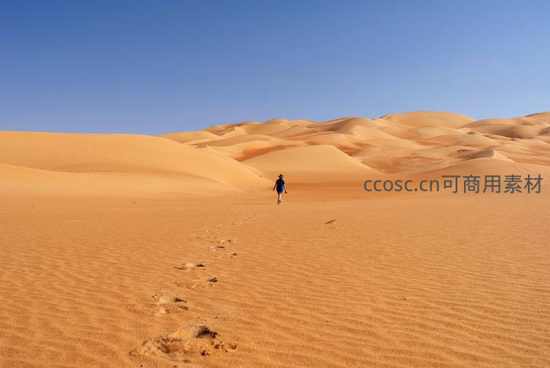 在无垠的金色沙海中,一个渺小的身影正朝着远方走去,身后留下一串清晰的脚印,凸显了人在自然面前的渺小与坚韧。