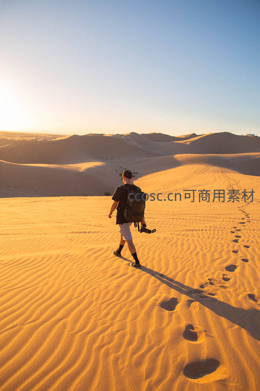 一名背着大包的摄影师在金色夕阳下沿着沙丘行走,长长的影子和脚印记录着他探索沙漠的每一步。