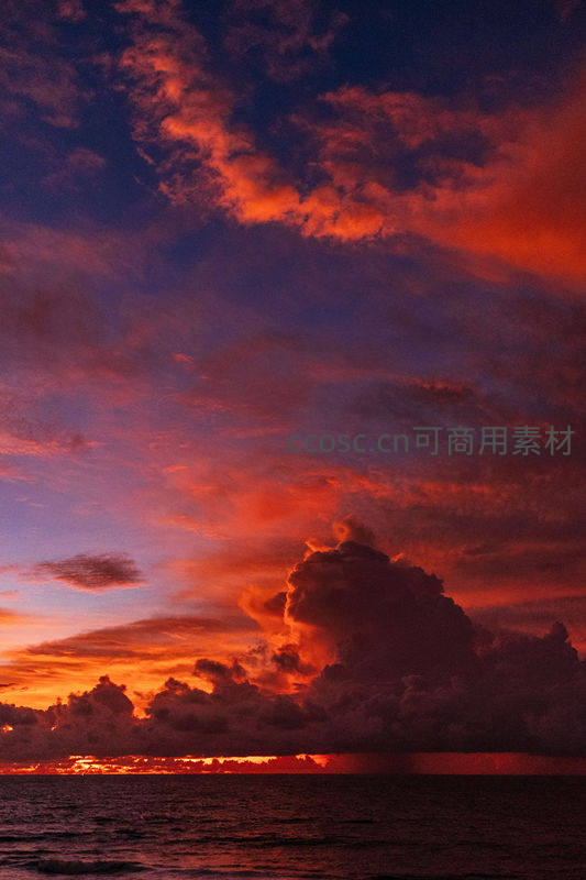 海平线上,巨大的云团被夕阳点燃,呈现出如火焰般燃烧的血红色调,波光粼粼的海面映照着这壮丽而震撼的自然奇观。