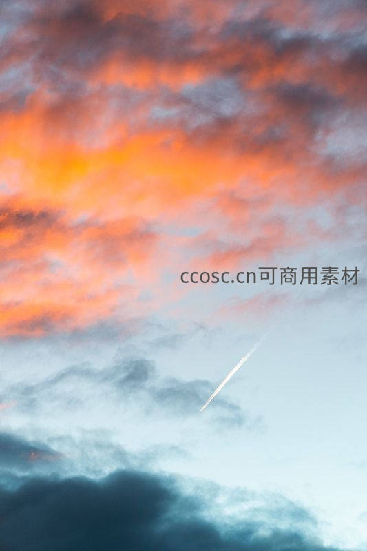 一架飞机划过被橙红与淡蓝渲染的绚丽晚霞天空,身后留下一道清晰的白色航迹,为静谧的自然美景增添了一抹现代动感。