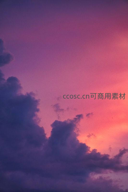 天空呈现出从深紫到粉红的柔和渐变,蓬松的云朵在霞光中显得格外梦幻,营造出一种宁静、浪漫且充满想象力的视觉氛围。