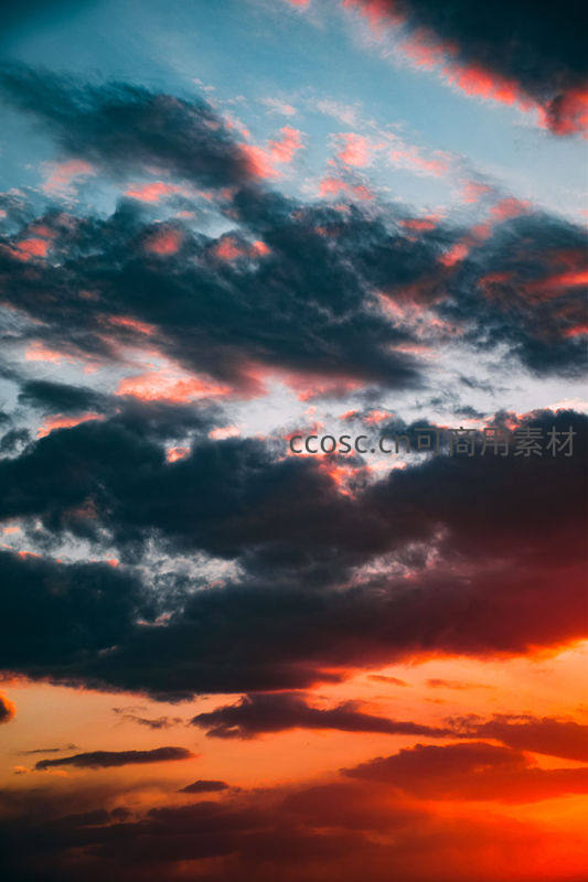 深邃的乌云与燃烧般的红橙色晚霞激烈碰撞,形成强烈的视觉对比,整个天空充满了动感与戏剧张力,预示着一场即将到来的风暴。