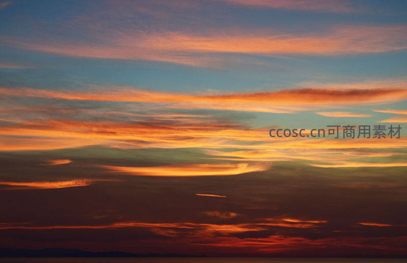 天空中层层叠叠的云彩被夕阳染成绚烂的橙红与深紫,如一幅流动的油画,展现了大自然鬼斧神工的色彩魔法。