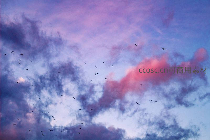 群鸟翱翔粉紫空,暮色云霞共翩跹