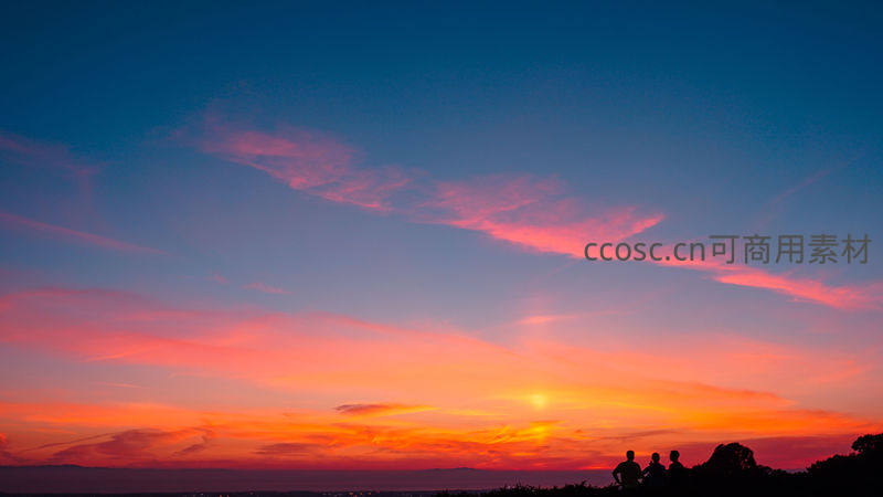 三个人的剪影在壮丽的日落背景下,天空被染成粉红与橙色,云层如画,充满宁静与诗意。
