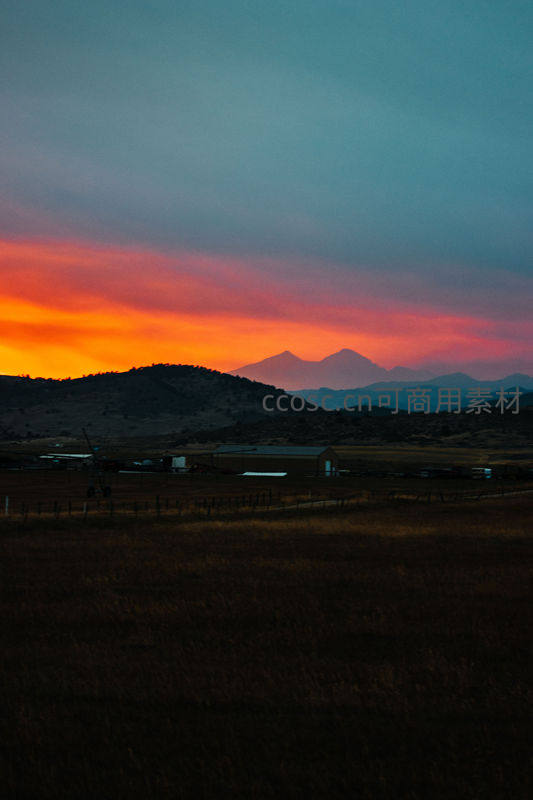 广袤的牧场与远处的山峦在夕阳余晖下披上暖色调,宁静的田园风光与壮丽天幕交织成一幅和谐画卷。