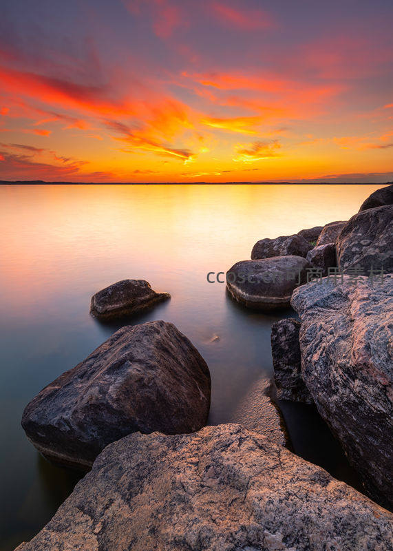 平静的湖面如镜,完美倒映着天边燃烧般的晚霞,前景的岩石静默伫立,营造出一片安宁祥和的意境。