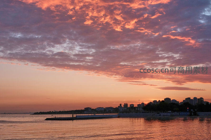绚烂的火烧云布满天际,下方是城市的黑色剪影和宁静的海港,自然的壮美与都市的轮廓形成鲜明而和谐的对比。