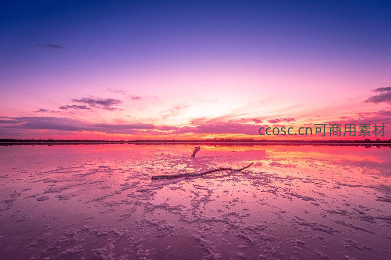 平静的盐湖如镜面般倒映着燃烧的晚霞,一根枯木横卧其中,为这幅粉紫渐变的天地画卷增添了一抹孤寂诗意。