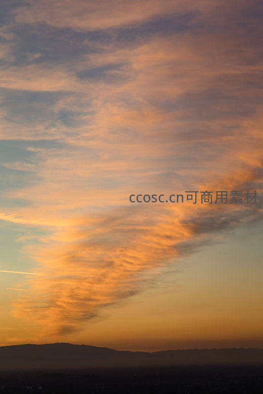 清晨的天空被流动的橙金色云海覆盖,柔和的光线洒向远方的山峦轮廓,营造出温暖而宁静的黎明氛围。