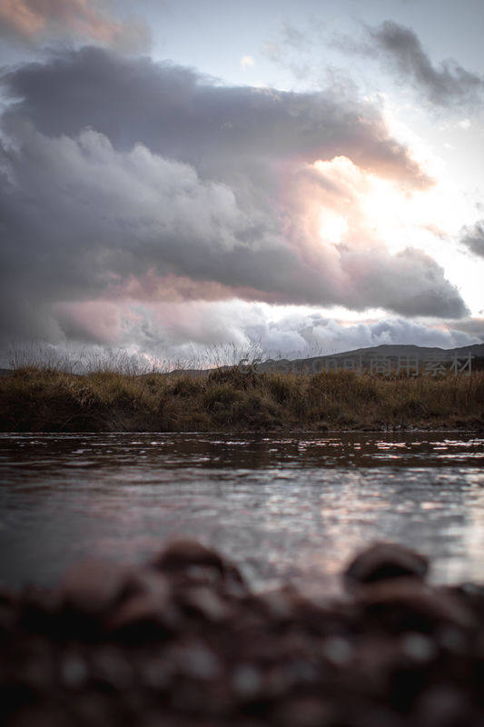 厚重的云层中透出一束金色阳光,照亮了河面与远处的山丘,近处模糊的河岸石块增添了画面的纵深感与神秘气息。