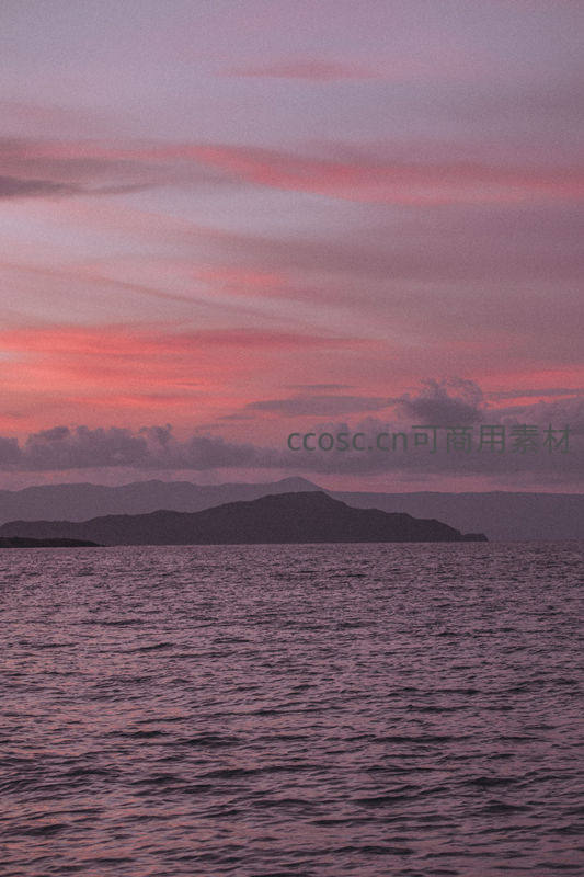 粉紫暮霭笼罩海面,远山如黛影朦胧