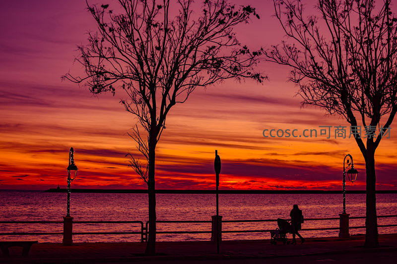 夕阳将天空染成紫红与橙黄的渐变,海边步道上行人推着婴儿车,树木与灯柱形成黑色剪影,宁静而温馨。