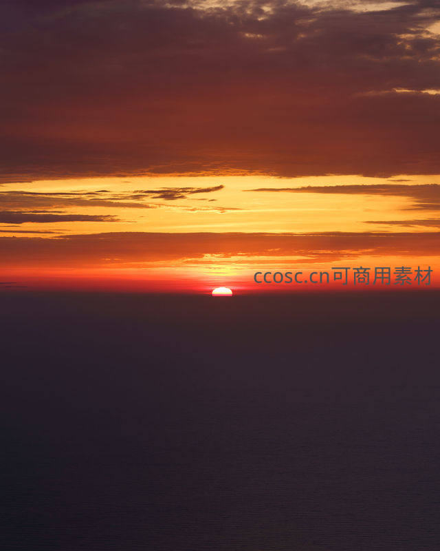 一轮红日缓缓沉入无垠的云海,将天空染成浓烈的橙红与深紫,下方是平静无波的深色海面,景象宏大而静谧。