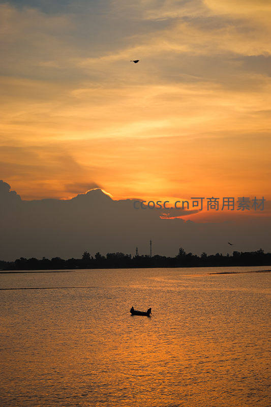 孤舟剪影映霞光,飞鸟掠过暮色天