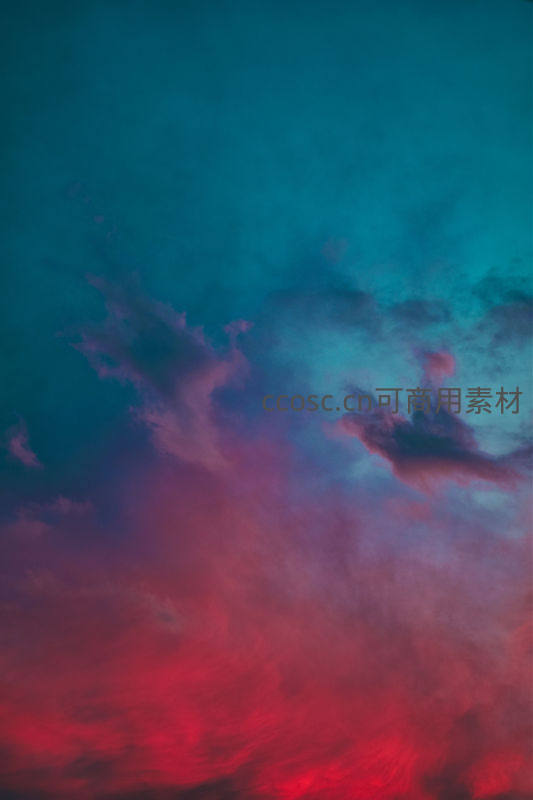 深邃的蓝色与炽热的红色在天空中激烈碰撞、柔和交融,形成一片如梦似幻的霓虹云海,充满强烈的视觉冲击力和艺术感。