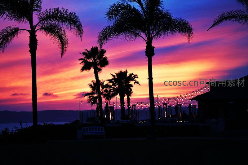 棕榈树影衬霞天,灯串点缀浪漫夜