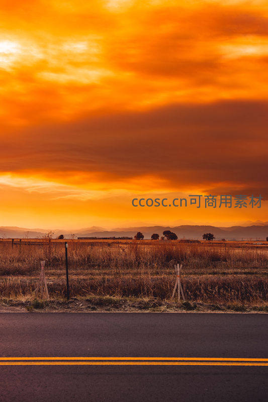 一条笔直的公路向前延伸,通向被火红晚霞笼罩的远方山脉,路旁的枯黄田野在金色光辉中显得格外宁静,充满旅途的遐想。