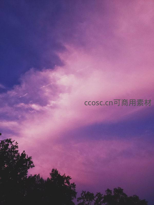 深紫色的天空被柔和的粉霞点亮,云层如丝绸般飘逸流动,树梢的黑色剪影为这幅梦幻画卷增添了层次与神秘感。