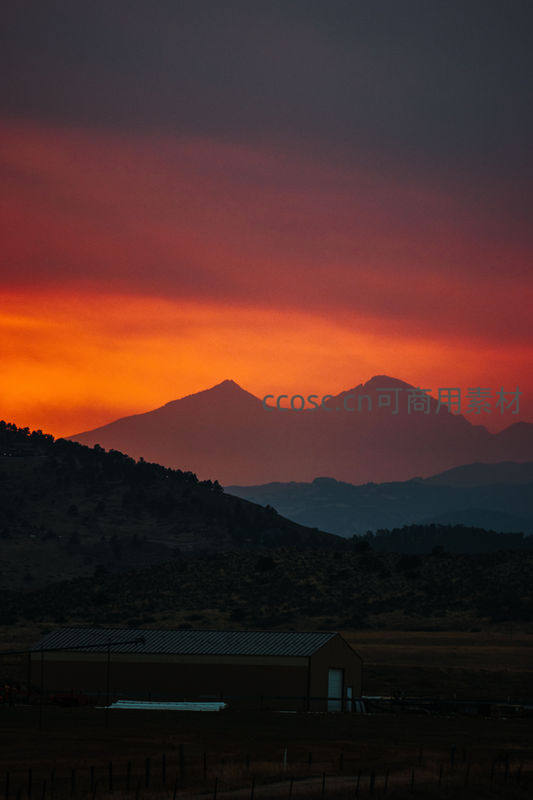 两座雄伟的山峰在炽热的橙红色霞光中显得格外壮丽,前景的农舍与田野在暮色中沉静安详,构成一幅充满田园诗意的黄昏图景。